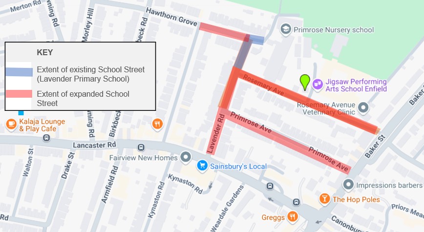 A map of the School Street zone for Enfield County School for Girls (Lower School) is shown below. The School Street will operate on: