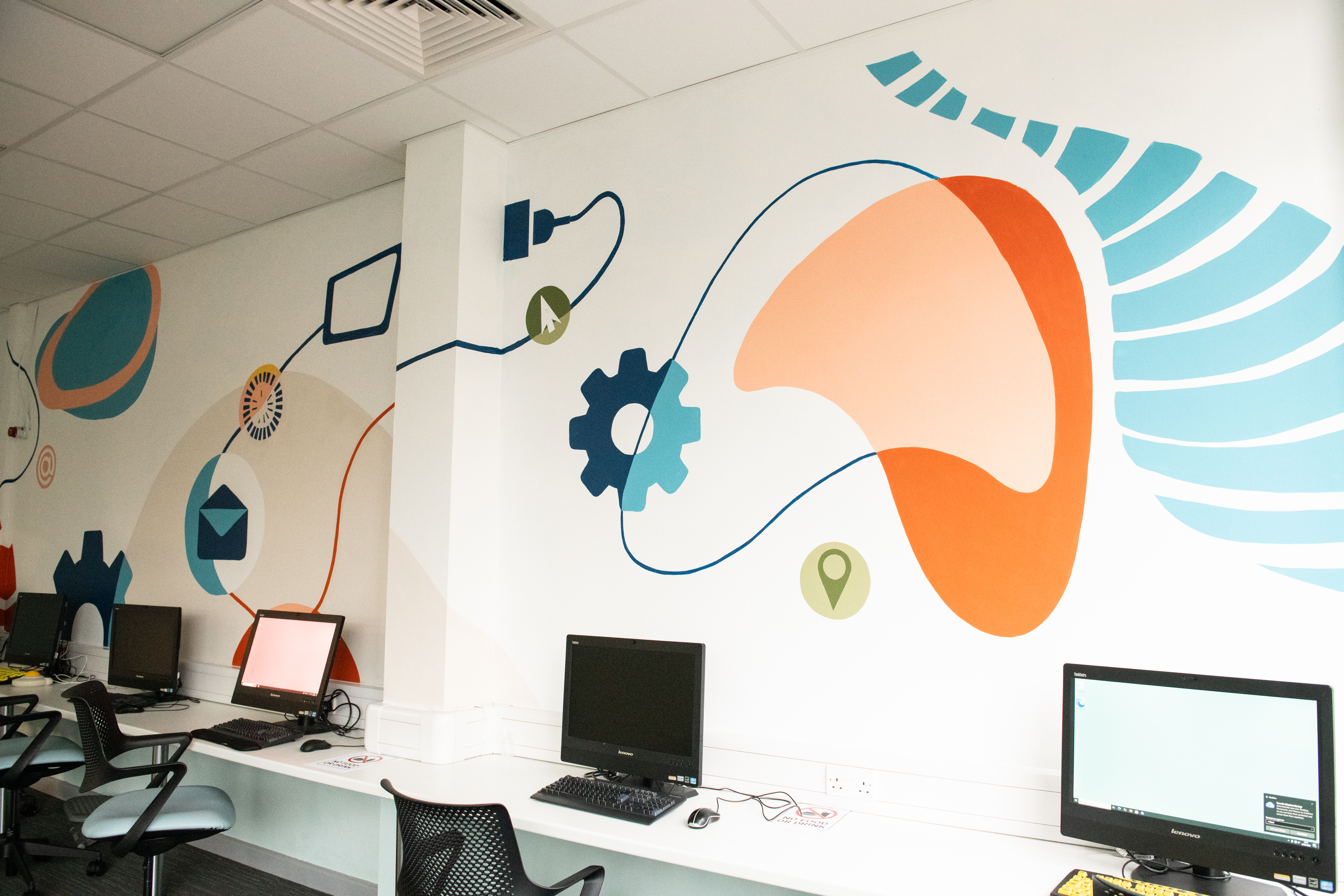 To support a calm and focused environment, the design uses a limited, muted colour palette, clean lines and repeating forms. These elements help to create a space comfortable and accessible for all users. The composition is intentionally fluid, guiding the eye smoothly around the mural and reflecting a sense of learning and continuity.