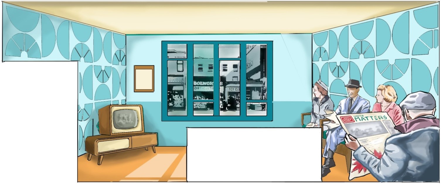 As your eye moves around the artwork, details from the decade begin to emerge. At the heart of the room, sits a 1950s Ferguson television sits, a subtle reference to Enfield’s rich industrial heritage. The wallpaper pattern is inspired by stencil designs created by service users during a workshop, when participants explored popular patterns of the 1950s. These designs have been carefully refined to create a calm and harmonious backdrop shaped by community creativity.