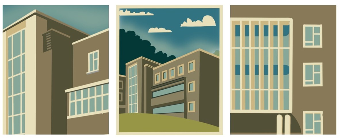 Each panel focuses on a small part of the 1950s building, zooming in to highlight details that often go unnoticed. By enlarging these sections, the mural brings out the bold lines and forms that give the building its character. These close-up views invite people to pause and look again and appreciate the design, rather than seeing the building as just a place to pass through.