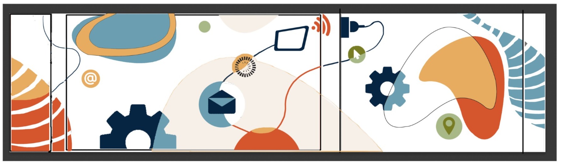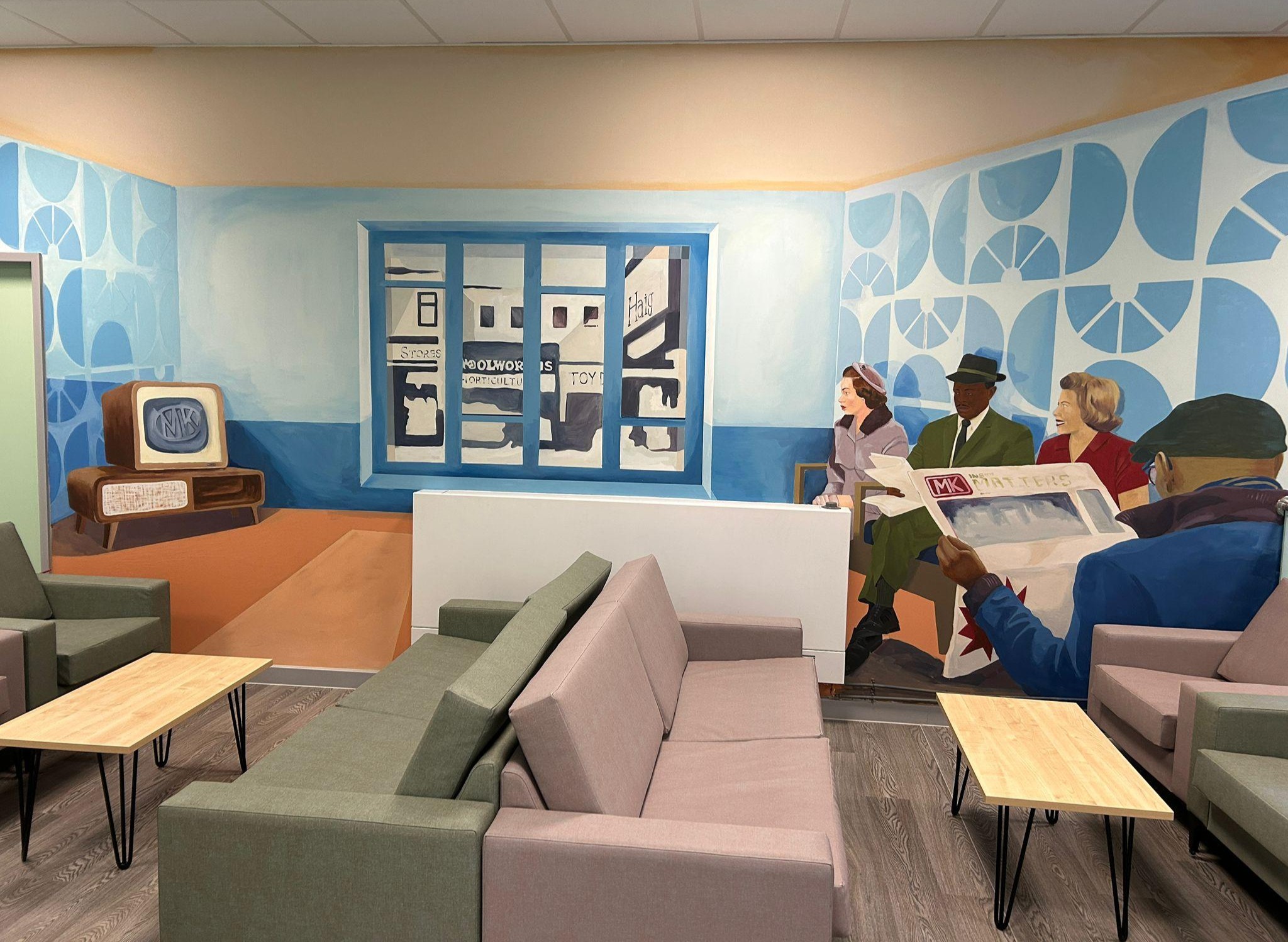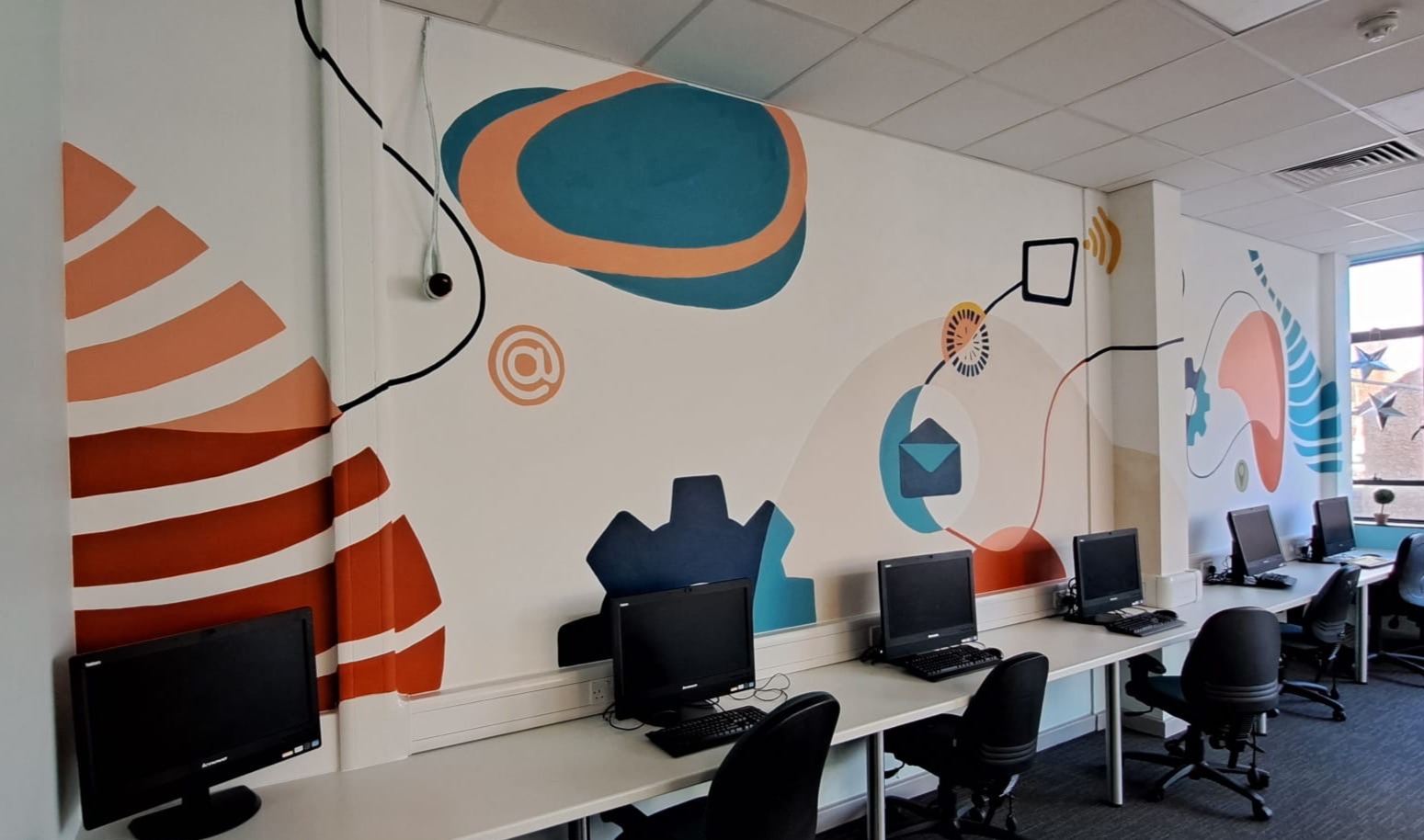 To support a calm and focused environment, the design uses a limited, muted colour palette, clean lines and repeating forms. These elements help to create a space comfortable and accessible for all users. The composition is intentionally fluid, guiding the eye smoothly around the mural and reflecting a sense of learning and continuity.