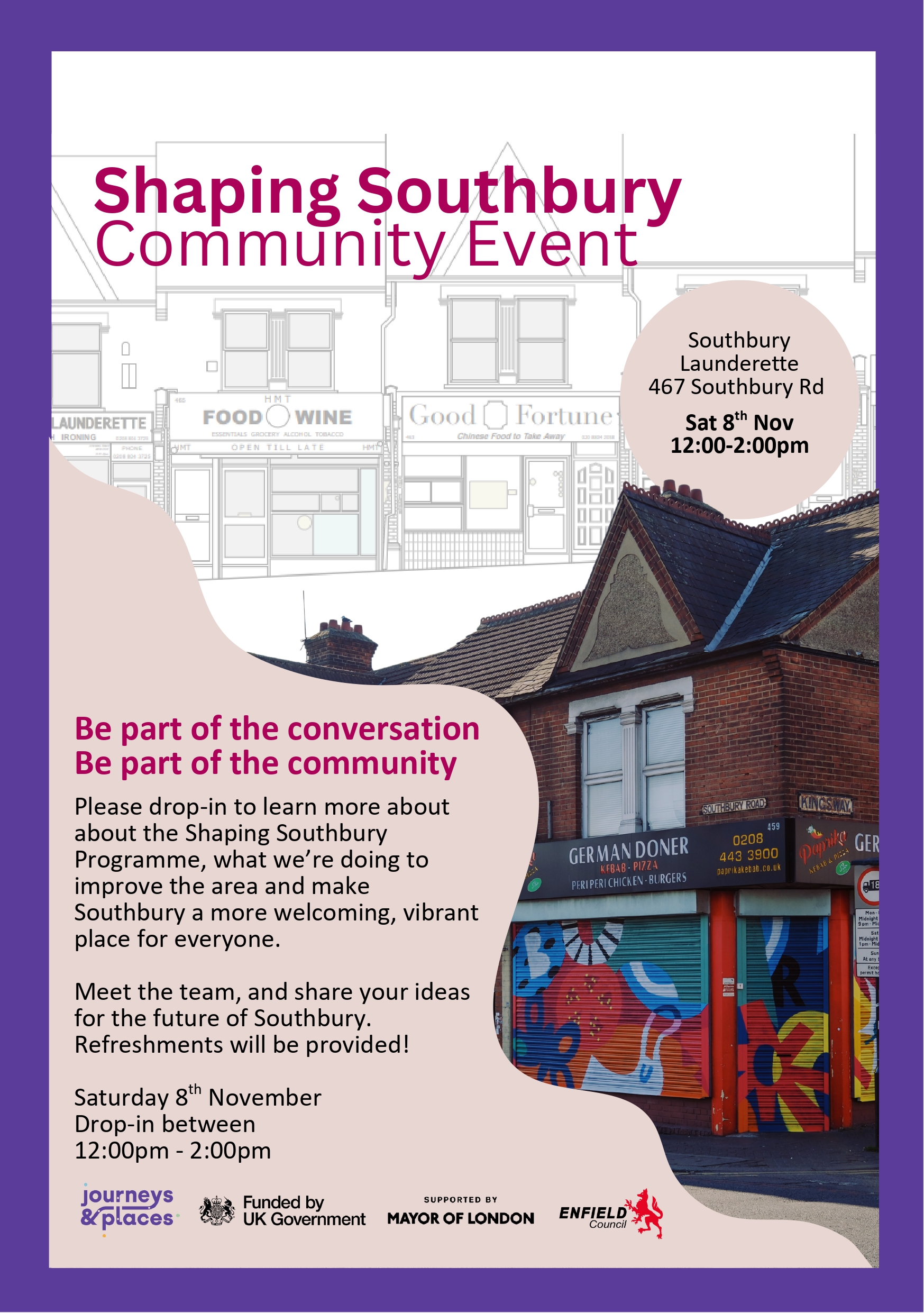 Drop in on Saturday 8 November, 12:00 pm–2:00 pm at Southbury Launderette to learn about the Shaping Southbury programme, including Shop Front Improvements, the new zebra crossing, and plans for the ‘This is Southbury’ Art Trail. Share your ideas to help make Southbury a more welcoming, vibrant community.