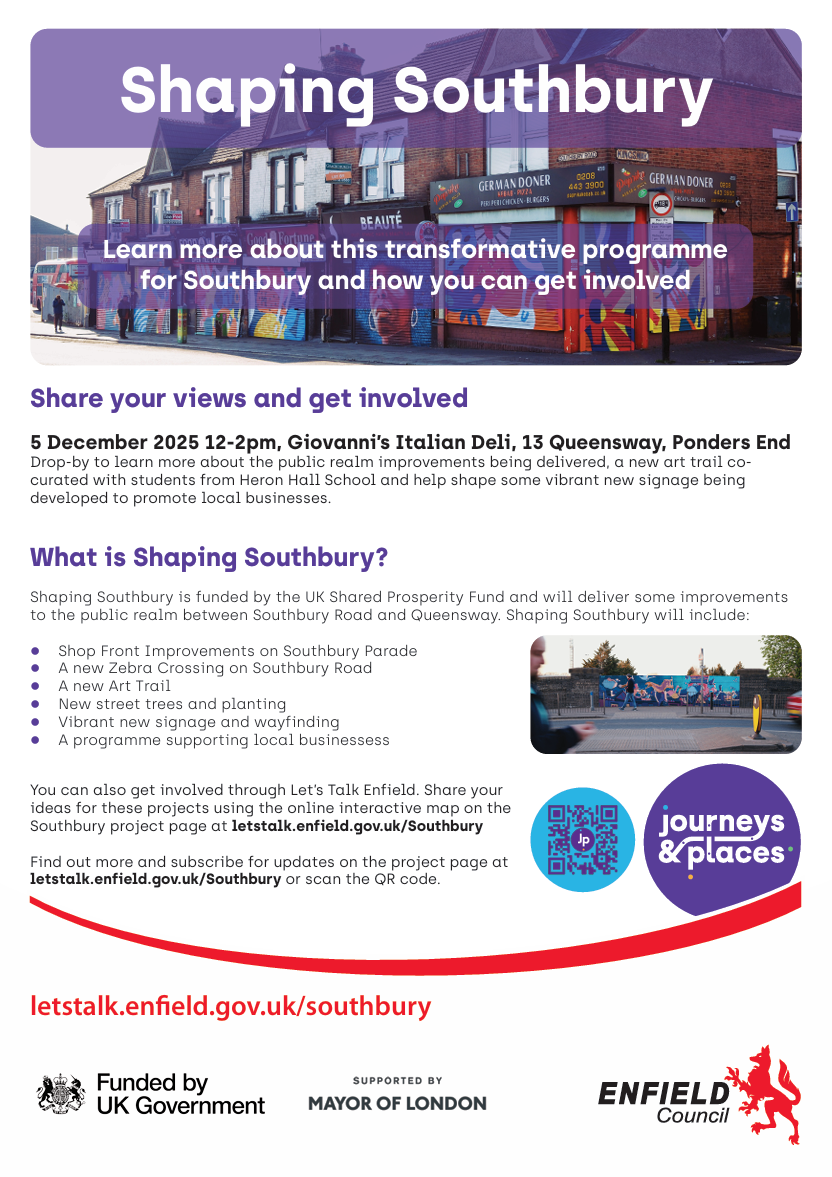 Drop in on Friday 5 December 2025, 12pm–2pm at Giovanni’s Italian Deli, 13 Queensway, Ponders End to learn about the Shaping Southbury programme. Hear about upcoming public realm improvements, explore ideas for a new art trail to be co-curated with students from Heron Hall School, and help shape new signage designed to promote local businesses.